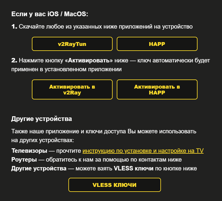 Вы можете выбрать любое из двух приложений (v2raytun или happ) на Ваше усмотрение.